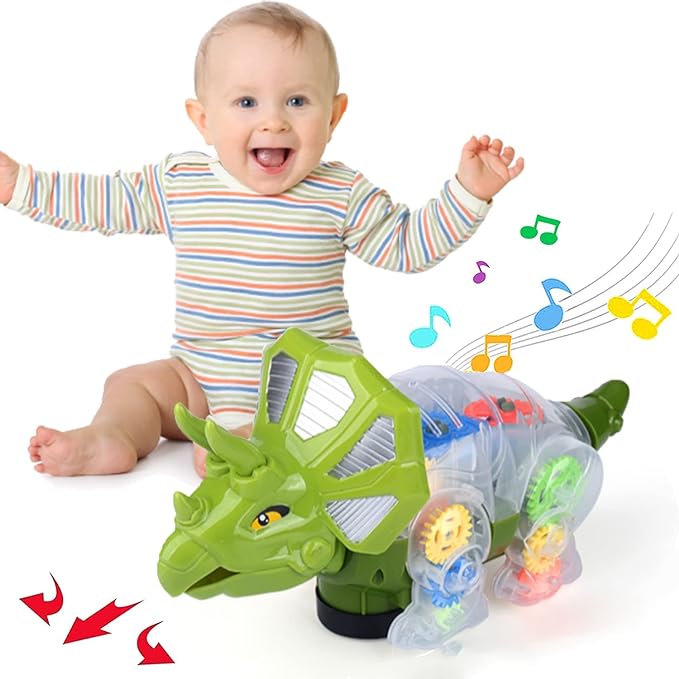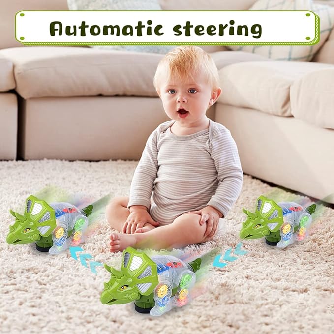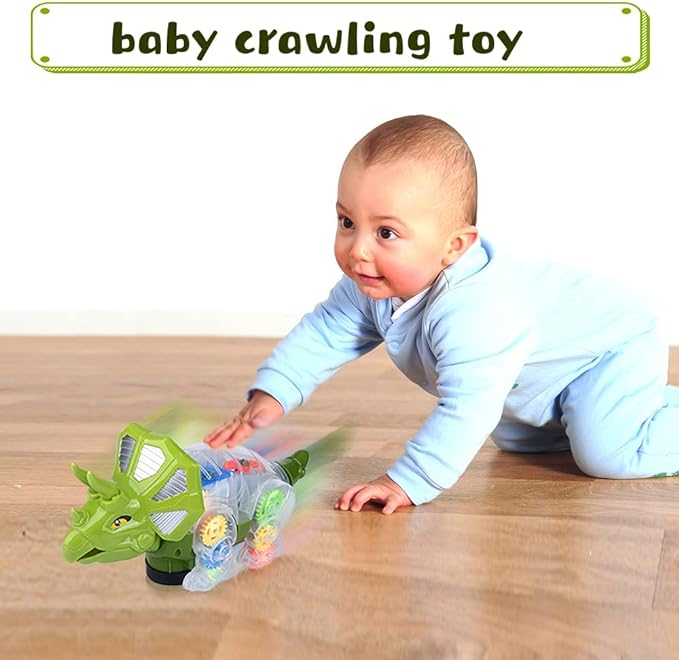 GEAR DINOSAUR CAR: This unique dinosaur-shaped car captures children's attention and provides hours of playtime. The moving car entices babies to chase and crawl after it.